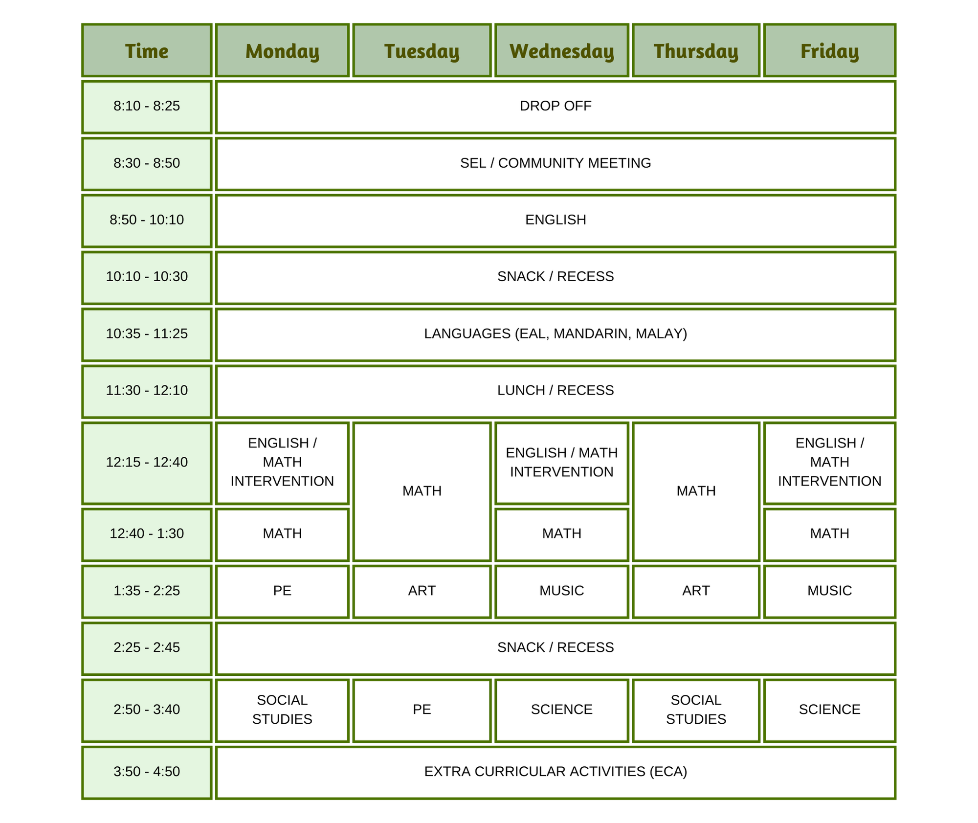 - World Languages: EAL, Bahasa Malaysia, Mandarin